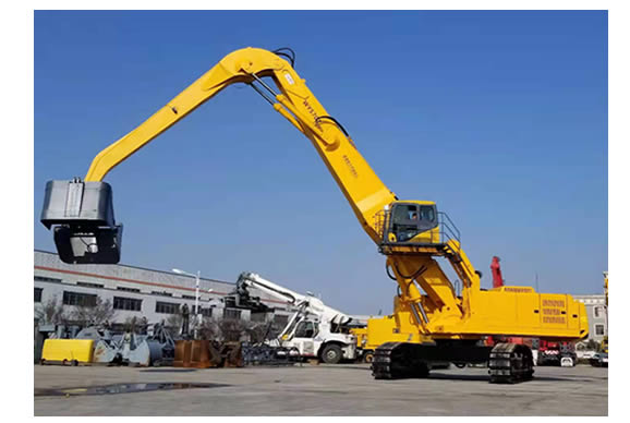 該設備分別采用了大功率“國三”標準發動機、380V 西門子電機,以及全套采用施耐德控制系統拖動控制兩套力士樂液壓動力機構及先導液力控制的世界首臺“雙動力”抓料機。該機設計了寬體結構梁,以及加強型可更換正、負差的二節式作業主臂,最大吊重量達 25 噸、最大作業半徑為 18米。在 5 至 12 米作業半徑內,可配備 5.0 立方蚌殼抓斗,或 2.5 立方梅花廢鋼抓斗。