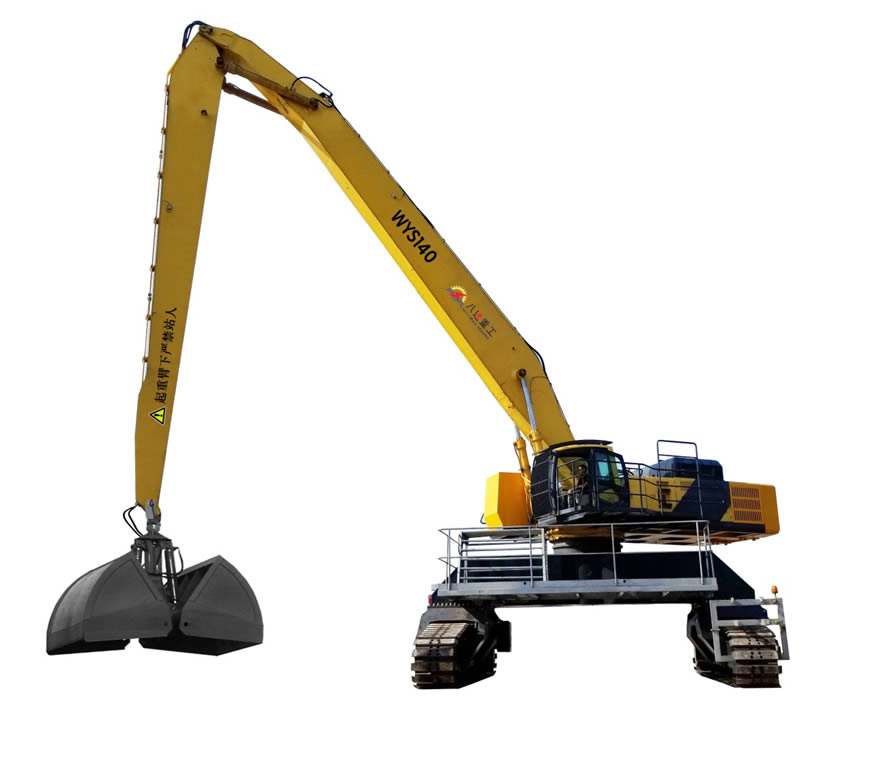 該設備分別采用原裝進口康明斯發動機、380V西門子電機,以及全套采用施耐德控制系統拖動控制兩套液壓動力機構,該機設計了寬體結構梁,以及加強型可更換正、負差的二節式作業主臂,最大吊重量達 25 噸、最大作業半徑為 24米。在5至12米作業半徑內,可配備 5.0 立方蚌殼抓斗,或2.5立方梅花廢鋼抓斗。